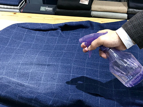 尚、ウェットクリーニングのお店についきましては、充分高級スーツの水洗い経験のある店舗を探してください。当店でもお客様が水洗いのクリーニング店にお出しになったのですが、スーツ全体が収縮してしまい、結局当店にお持ちになり、スーツを分解し、毛芯等付属品にまでプレスをかけ直して差し上げたケースがありました。高級スーツのウェットクリーニングを行っている店舗で本当に丁寧な仕事をする店舗ではまず、お客様から預かったスーツの採寸を行います。つまり、クリーニング後収縮していないかを確認し、収縮していたら直すためです。またクリーニング中、型崩れをしないようにスーツの各部位を仕付け糸で留める工程を持っているものです。さらに、最初にドライクリーニングでドライでしか落ちない汚れを落とした後に、ウェットクリーニングにはいるのです。このやり方がすべてではないと思いますが、前もって電話等で水洗いの工程について質問してみるというのも一案であると思います。