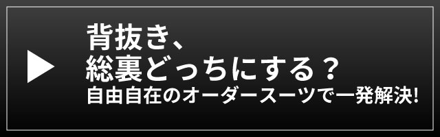 裏地がある分、スーツ生地との摩擦抵抗も少なく、傷みにくく長く着ることができます。よいことずくめの総裏仕立てスーツですので、夏場でもお勧めになりますが、自分のビジネスシーンに合わせ、背抜きと総裏をチョイスするのがスーツの楽しみのひとつでもあります。