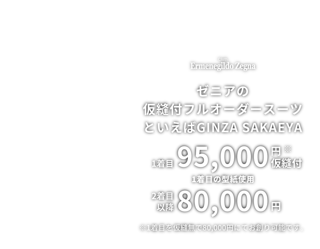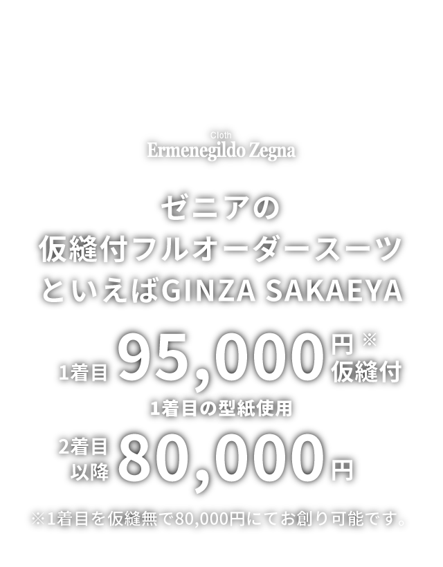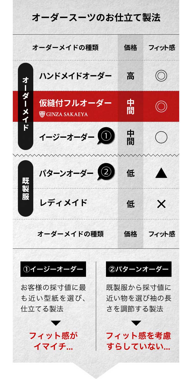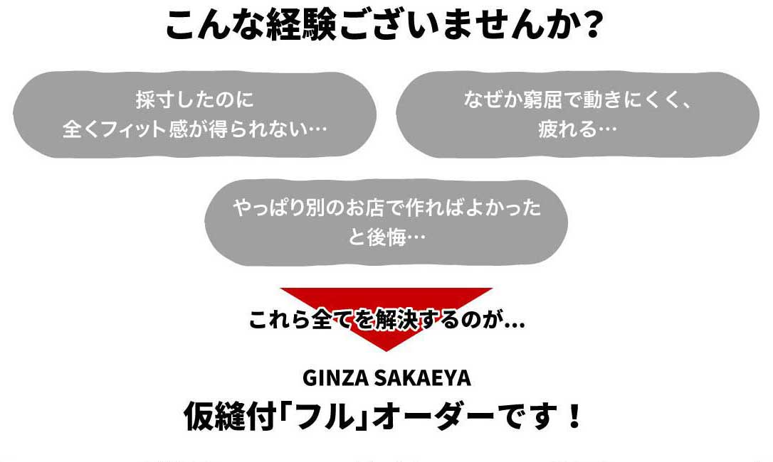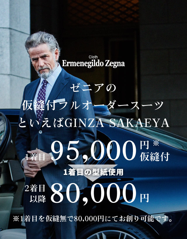 一般的なオーダースーツとは似て非なるGINZA SAKAEYAの仮縫付ゼニアの「フル」オーダー。身体に合ったスーツとは、サイズを合わせるだけではありません。個々によって異なる身体のクセを見極め、スーツに反映させることで完成します。そのための重要な工程が「仮縫い」です。たった一度の採寸データだけで作るパターンオーダーでは実現不可能な、すべてにおいて完璧な1着をお約束いたします。