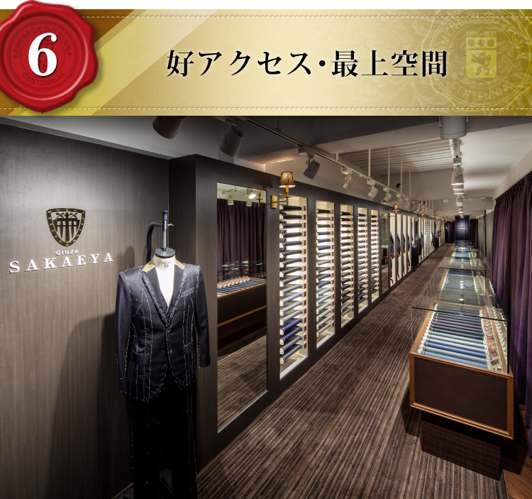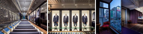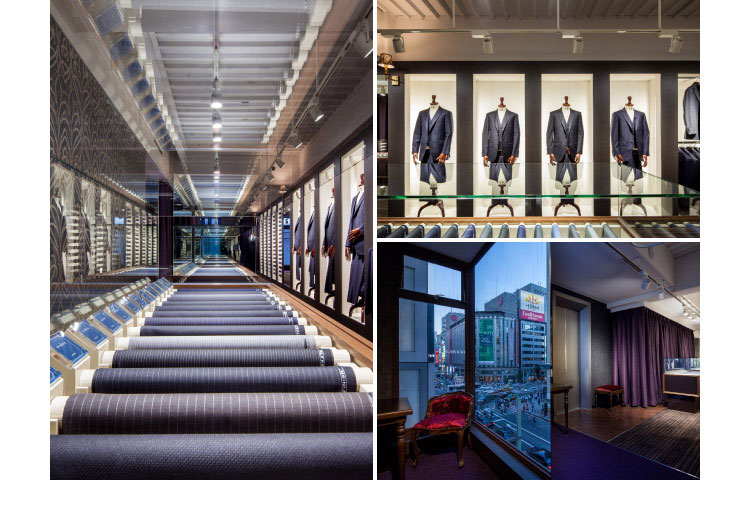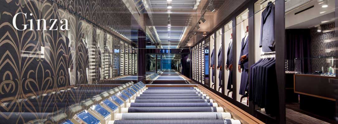 最高級のゼニア生地をしっかりと吟味していただくため、アクセスしやすい銀座四丁目に店舗を構え、生地の配置、展示方法までも追求。こだわり抜いた上質な空間で最高のゼニアオーダーメイドをお創りいただけます。