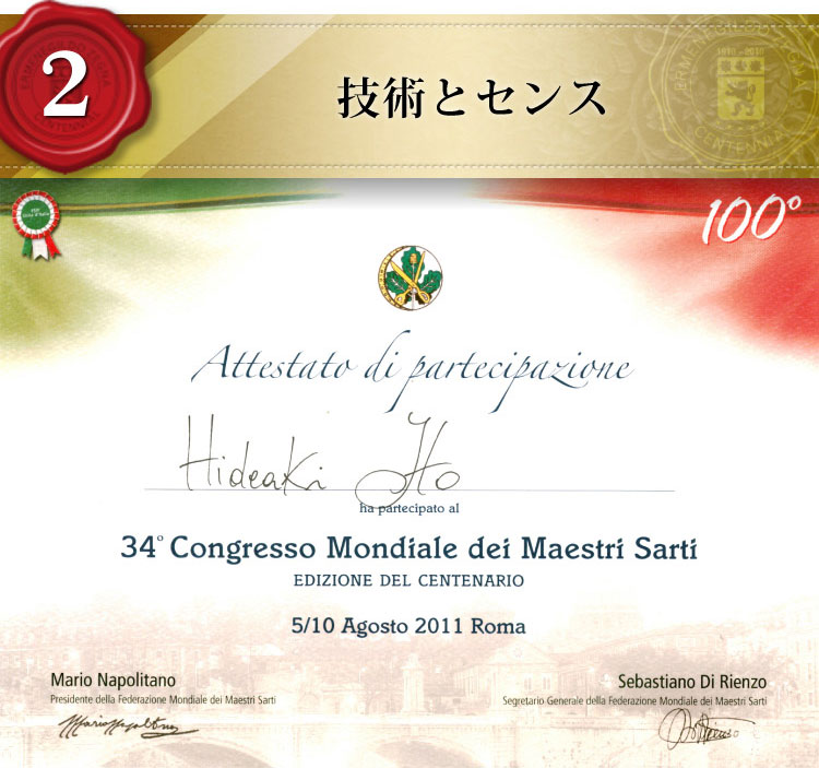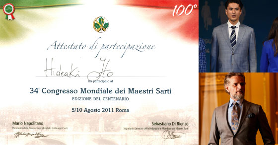 GINZA SAKAEYAが持つ技術は、日本国内をはじめ海外でも高く評価されています。例えば、2011年8月イタリア・ローマで開催された「注文紳士服業者連盟世界大会」に日本代表8社のうちの1社としてビジネススーツ部門に出品。以来4大会連続で2013年韓国、2015年フィンランド、2017年中国で開催された「注文紳士服業者連盟世界大会」においてもビジネススーツ部門に唯一の日本代表として出場しました。この事実は現在の日本におけるビジネススーツ分野において、GINZA SAKAEYAは日本最高峰の技術を持つ店舗として認められたということになります。