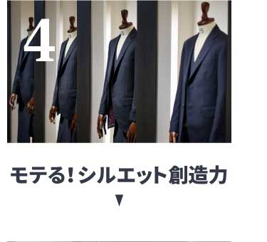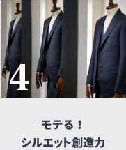 - ①肩幅をやや狭くすることで、スーツ全体をシャープに魅せる。