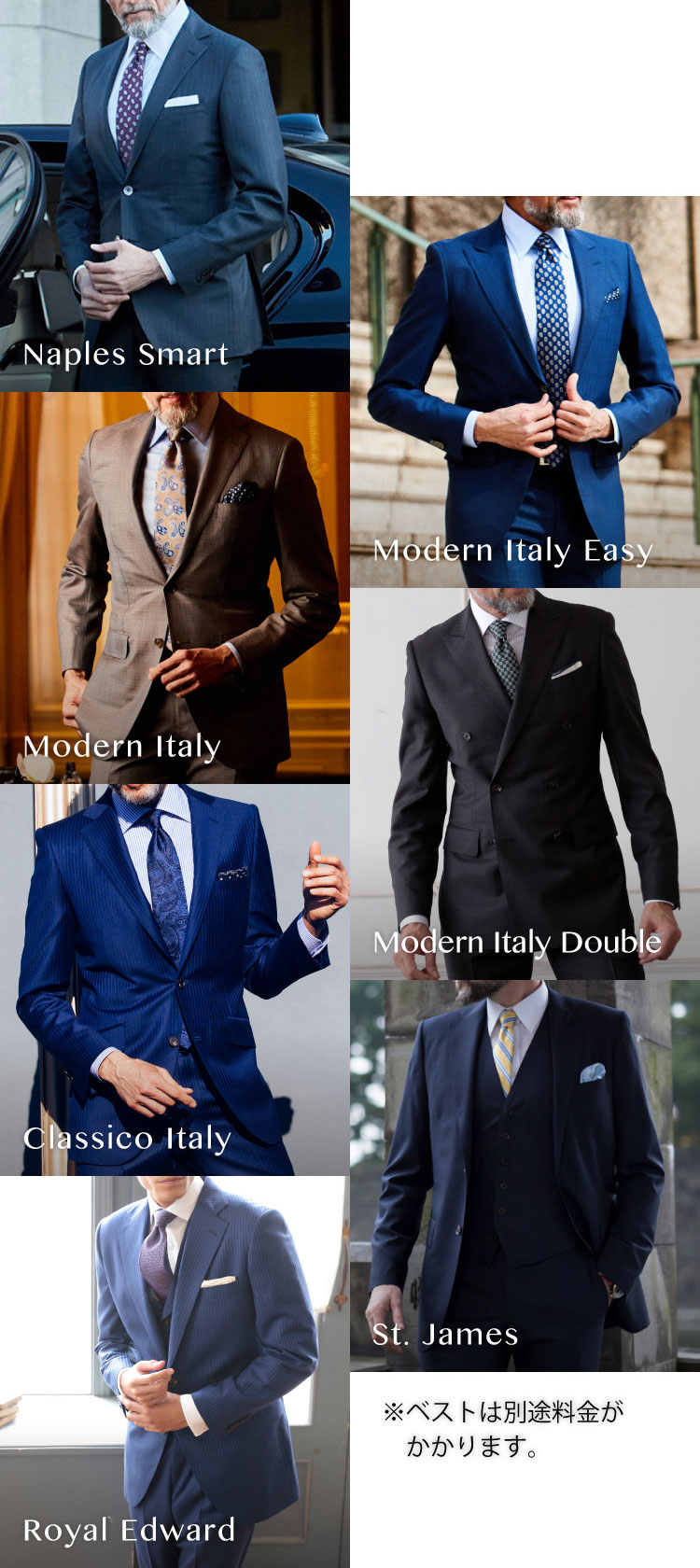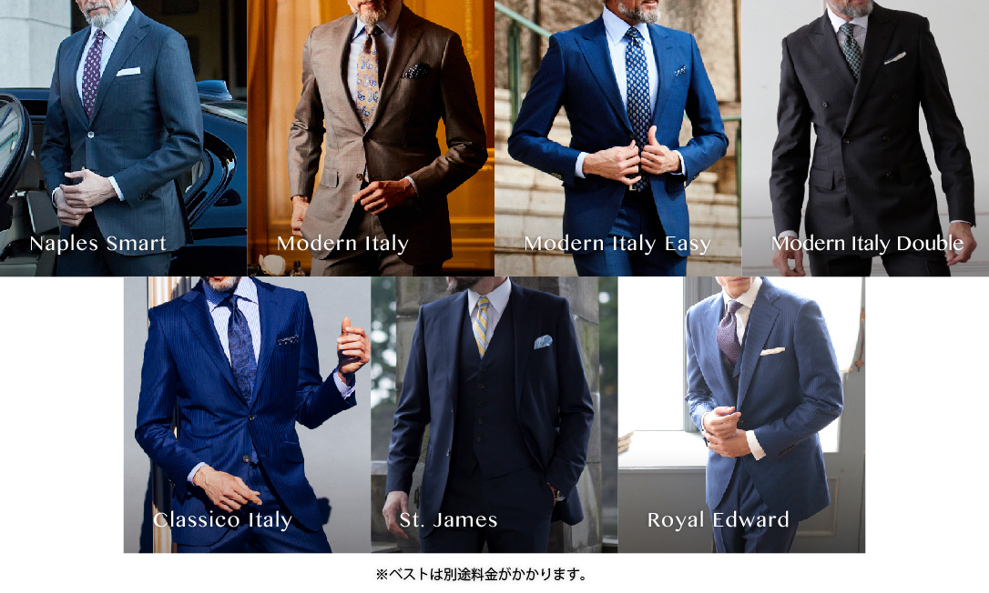 世界最高峰の生地を用いたスーツにふさわしい、ハイブランドで現在展開されている7種類のスーツモデルを忠実に再現してご用意いたしました。いずれも「仮縫い」を行うことでお客様の身体にピッタリと寄り添う、スマートシルエットのスーツをお仕立ていたします。