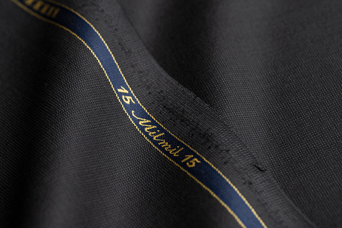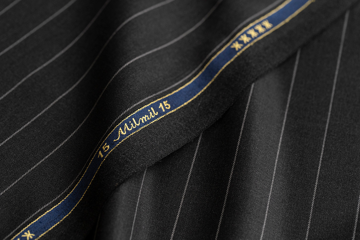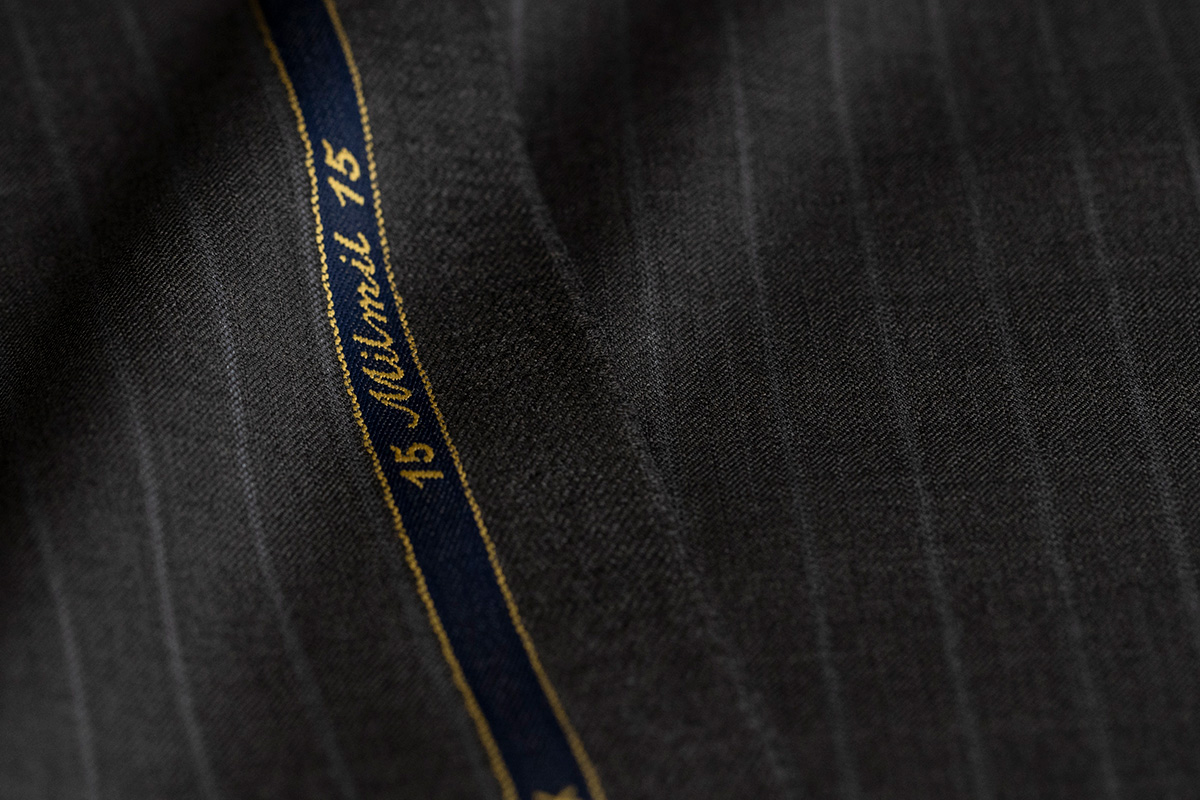 商品名 15Milmil15 色 チャコールグレー 柄 チョークストライプ 説明 ウール100% 価格 出来上価格180,000円 (税別) 15Milmil15の最大の特徴であるsuper170'sの超極細糸から放たれる圧倒的なドレープ感と光沢感に加え、 およそ2㎝ピッチに組み込まれたチョークストライプとベースカラーのチャコールが貫禄と自信を与えてくれます。
