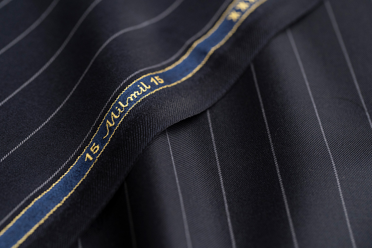 商品名 15Milmil15 色 ネイビー 柄 チョークストライプ 説明 ウール100% 価格 出来上価格180,000円 (税別) 15Milmil15の最大の特徴であるsuper170'sの超極細糸から放たれる圧倒的なドレープ感と光沢感に加え、 およそ2㎝ピッチに組み込まれたチョークストライプとベースカラーのネイビーがエレガントな雰囲気を際立たせます。