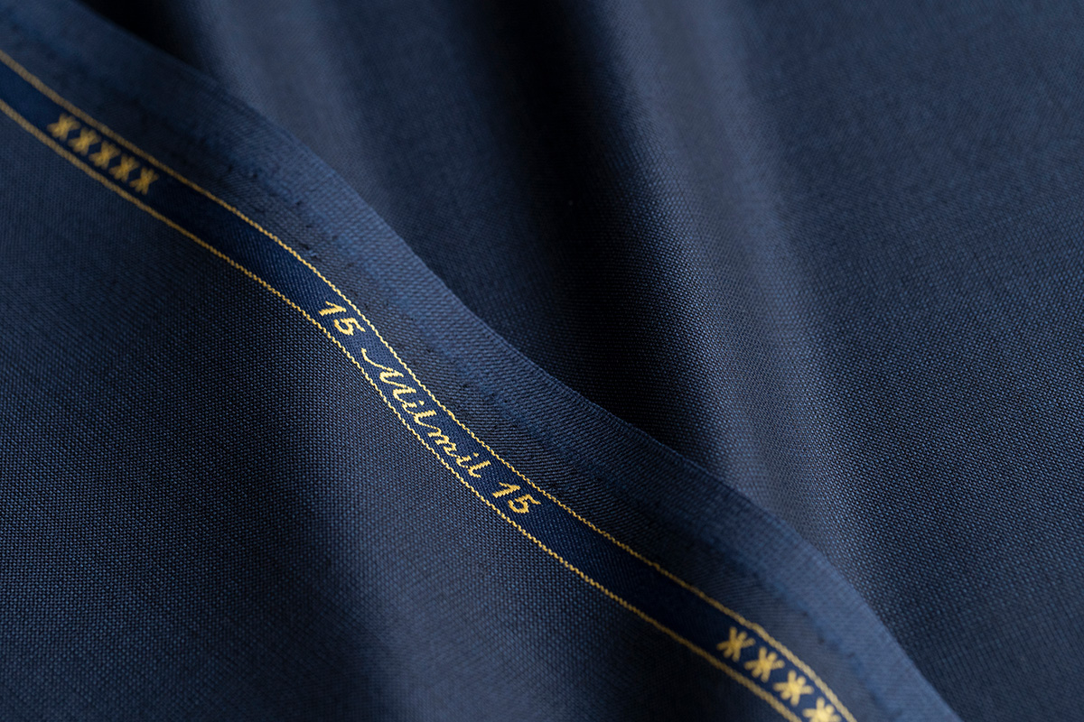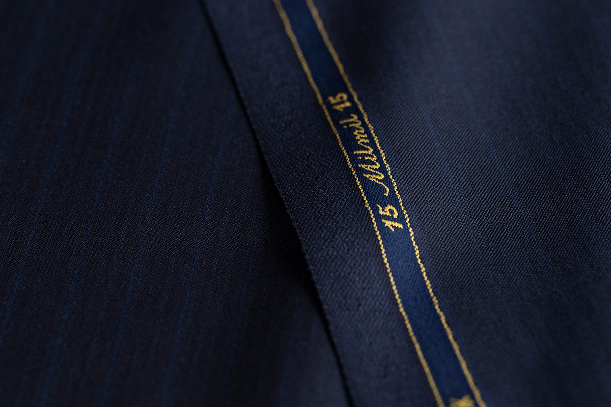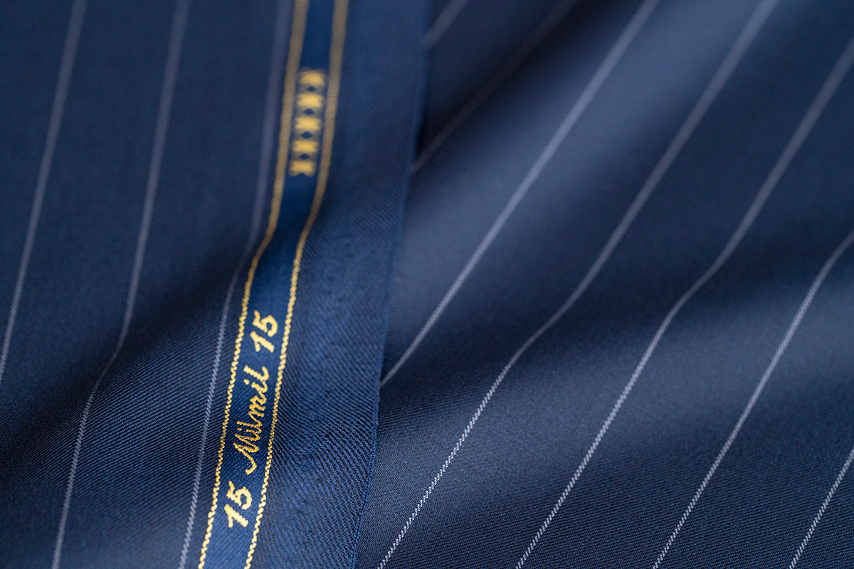 商品名 15Milmil15 色 ブルー 柄 チョークストライプ 説明 ウール100% 価格 出来上価格180,000円 (税別) 15Milmil15の最大の特徴であるsuper170'sの超極細糸から放たれる圧倒的なドレープ感と光沢感に加え、 およそ2㎝ピッチに組み込まれたチョークストライプと爽やかなブルーのベースカラーが他を魅了します。