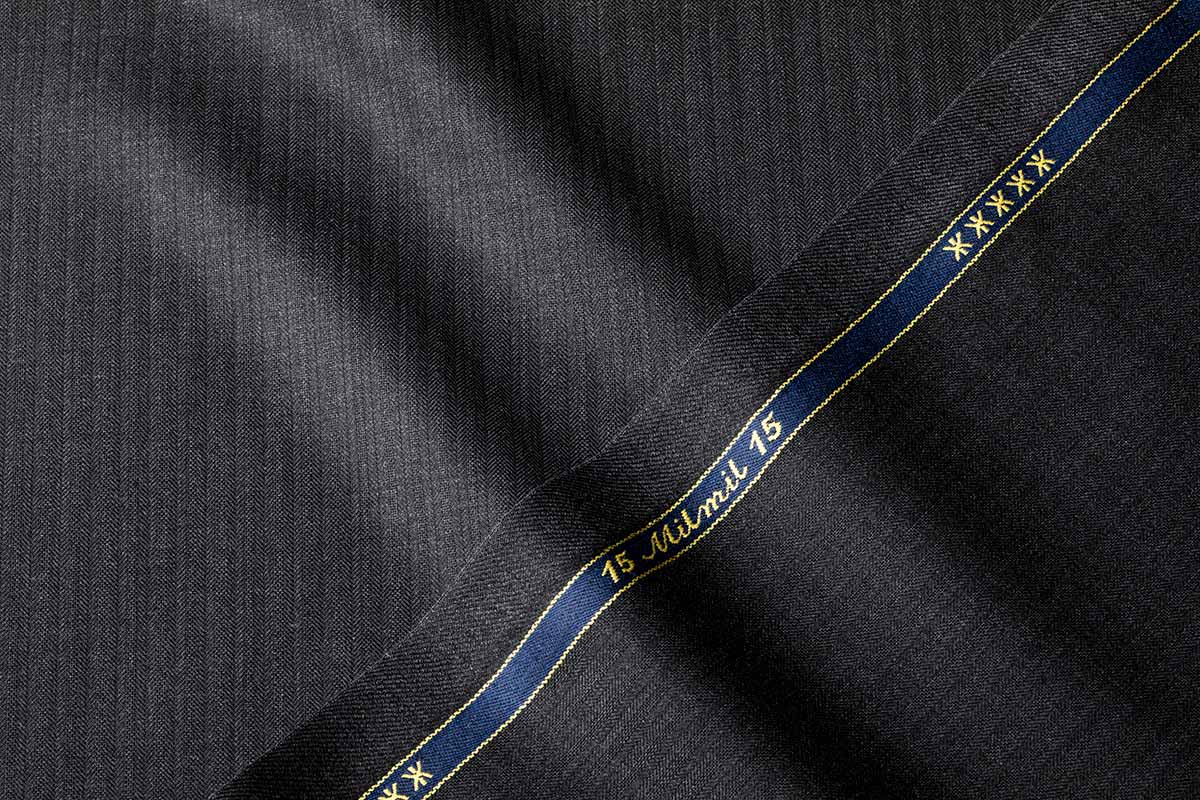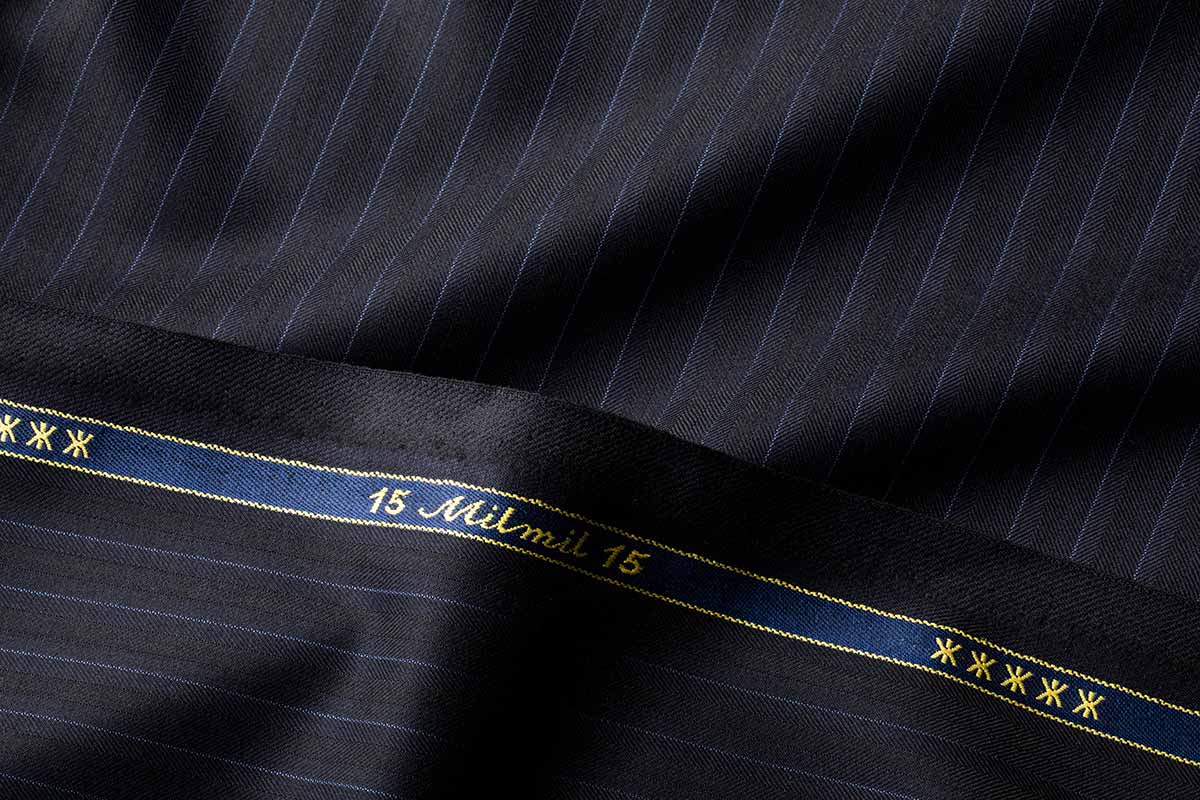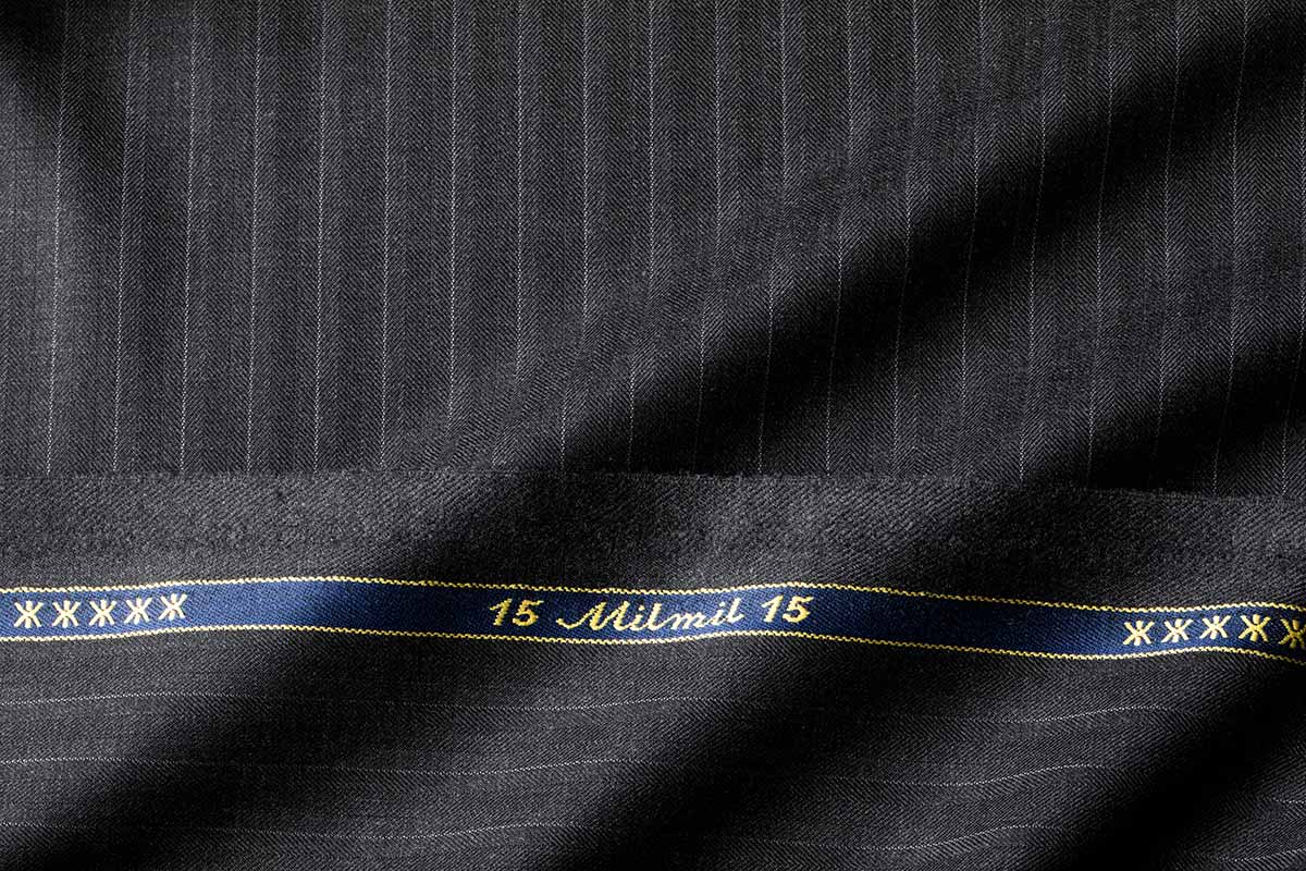 商品名 15Milmil15 色 チャコール 柄 シルバーストライプ 説明 ウール100% 価格 出来上価格180,000円 (税別) ゼニア社で年間全体の5%しか生産されない希少価値の高いsuper170'sの15Milmil15。1㎝ピッチに走るピンストライプと光の当たり方によって浮き出るシャドーストライプを組み込んだ今秋冬からのNewFabric。チャコールグレー×白ストライプが貫禄のある雰囲気を表現します。