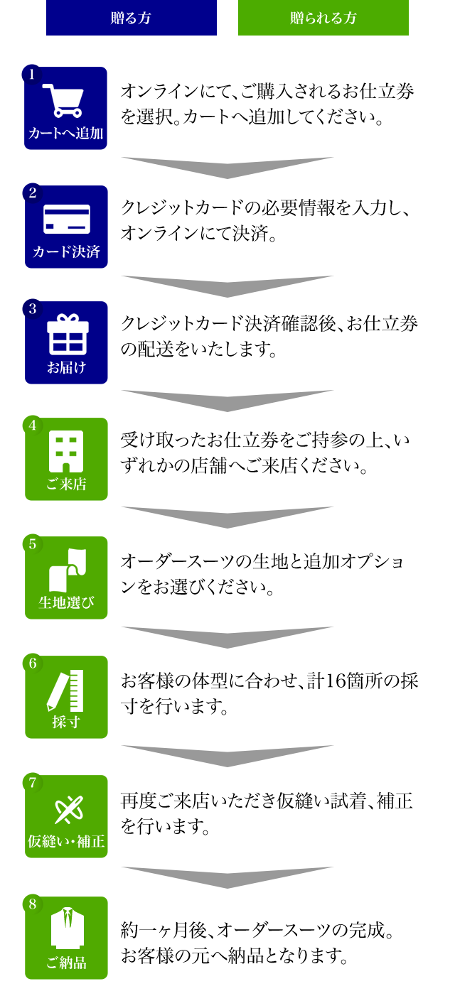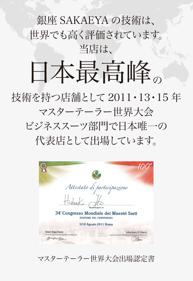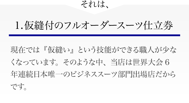 職人による完全なるハンドメイド工程でお創りします。仮縫いならびに中縫い付き。マスターテーラー世界大会ビジネススーツ部門日本代表作品と同様の工程でお創りします。